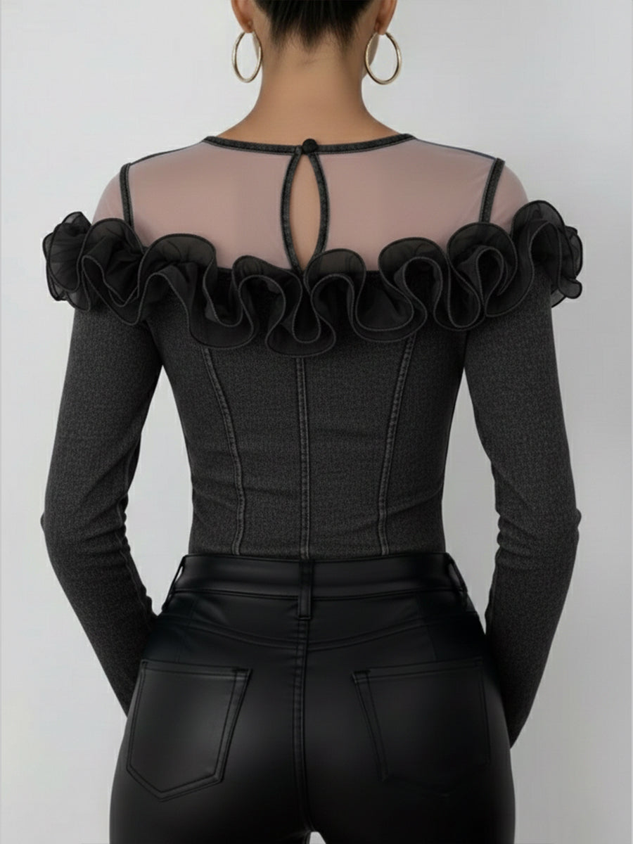 Haut en Denim Rétro avec Volants en Organza en Maille Patchwork